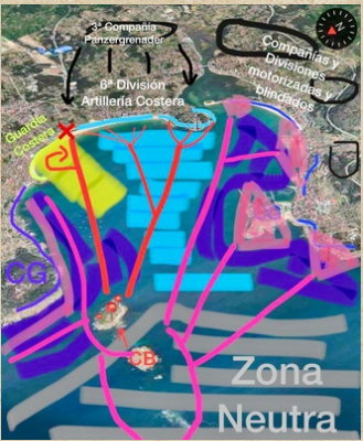 La imágen de arriba es un plano del estado mayor del ejército y el ING de Infantes de los Caballeros durante los días 2, 3 y 4 de julio de 2019 (días en los que se efectuó el desembarco).